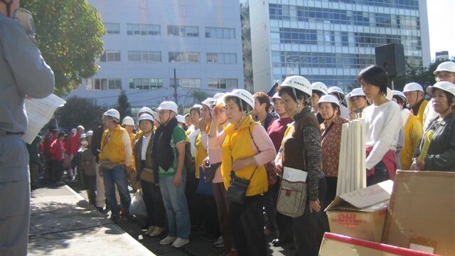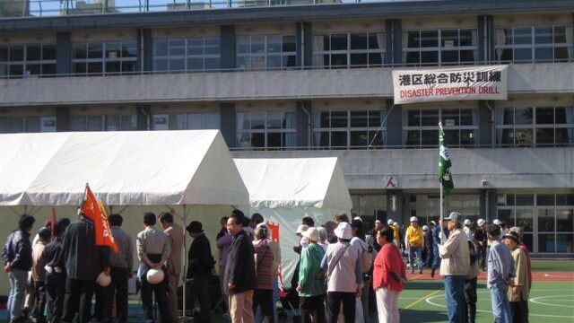 10月28日、芝浦小学校校庭で港区・地域総合防災訓練が実施された。地域の各町会・自治会の皆さん、そして消防・警察署、行政等関係機関の職員など総勢570名が参加。前日の台風で開催が危ぶまれたものの早朝から好天となり、訓練は事故もなく無事終了した。今年の訓練は、従来の初期消火訓練などのほか、①避難所生活を想定し、6畳間くらいの狭いスペースでの休憩体験、②AED(徐細動自動体外徐細動器)のとり扱い、③模擬倒壊家屋からの被災者救助訓練などが実施された。